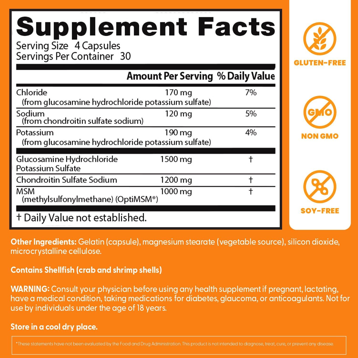 - REDUCES JOINT DISCOMFORT - Each daily serving delivers 1000 mg of MSM(OptiMSM), 1500 mg of Glucosamine, 1200 mg of Chondroitin. Combined they work together to help reduce joint discomfort including pain, lack of flexion, joint stiffness and weakness.*