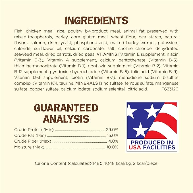- Friskies cat treat made with real fish as the first ingredient and 2 calories per treat