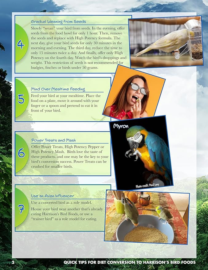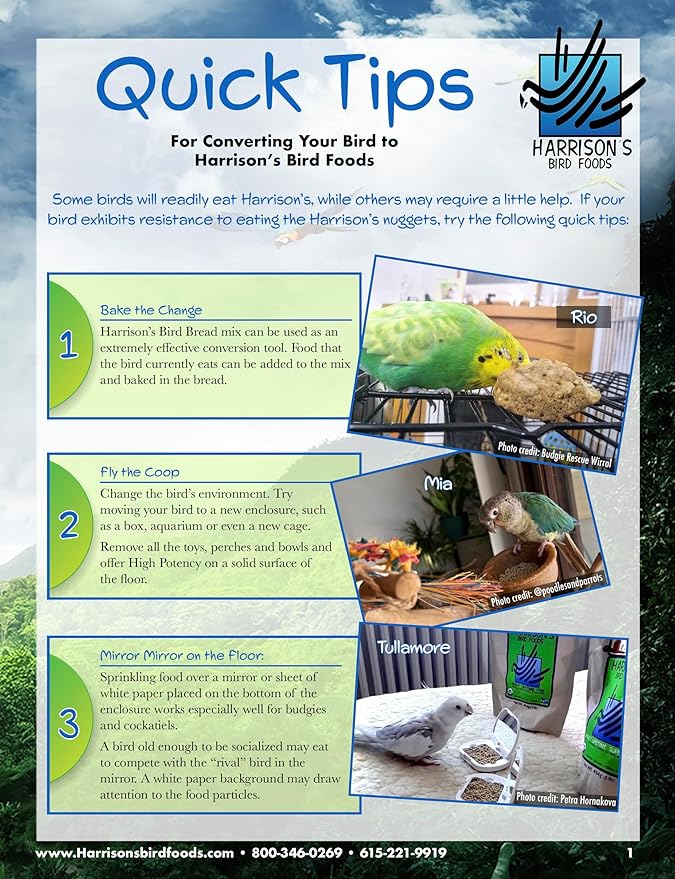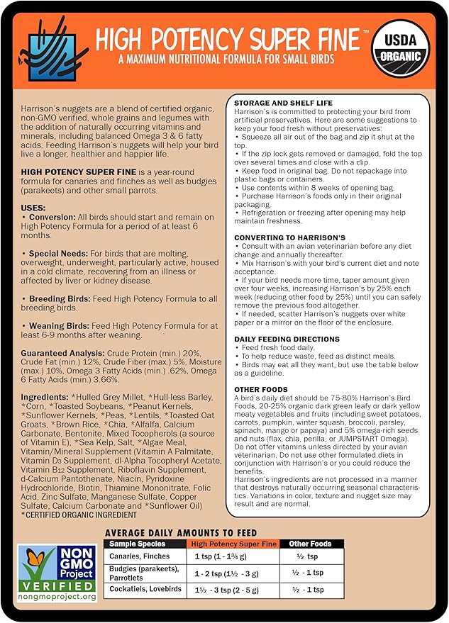 - FOR SMALL BIRDS: Harrison's Bird Foods HIGH POTENCY SUPER FINE, a certified organic, non-GMO formula crafted by avian veterinarians and avian nutritionists for canaries, finches, budgies, parrotlets, cockatiels, lovebirds, and other small birds. It ensures essential nutrition in a nutrient-dense formula for converting to our formula, under 1 year of age, breeding, weaning chicks, recovering from an illness, or molting.
