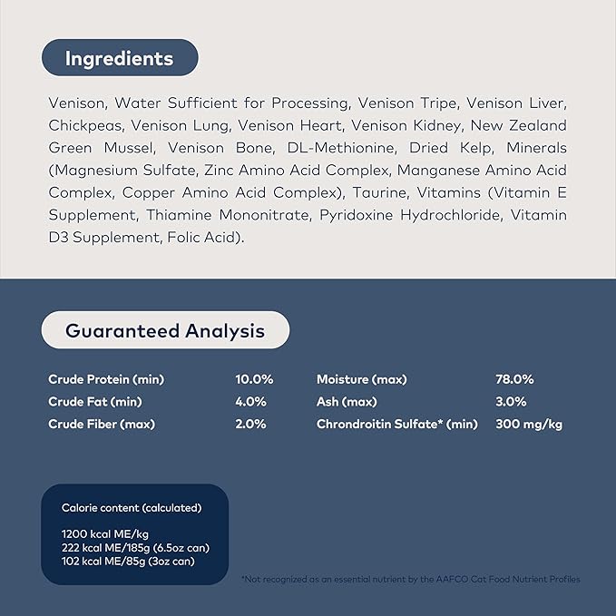 - HIGH PROTEIN, NUTRIENT DENSE, MOISTURE RICH: Featuring free-range Venison, Organs, Bone, and New Zealand Green Mussels, this grain-free pate style cat food delivers premium nutrition with a mouth-watering taste for all cats and life stages. This moisture rich, chunky-loaf canned cat food uniquely support cat hydration.