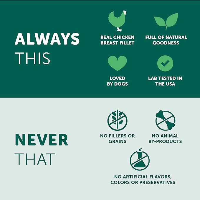 - WHOLESOME INGREDIENTS - With chicken breast as the first ingredient, these treats are high in protein and low in fat, and are made without the use of artificial flavors, colors, preservatives, or fillers.