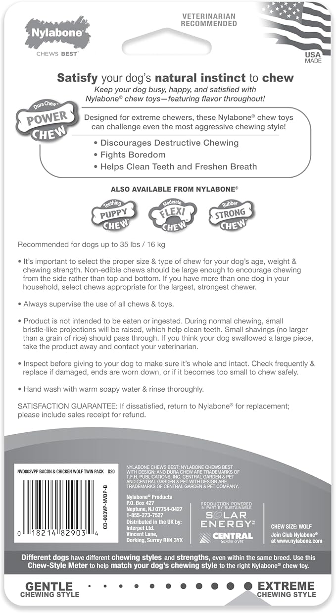 Nylabone Original Bone Power Chew Toy for Dogs, Durable Dog Toys for Aggressive Chewers, Basted Blast Bacon & Chicken Flavor, Medium - Up to 35 lbs, 2 Pack