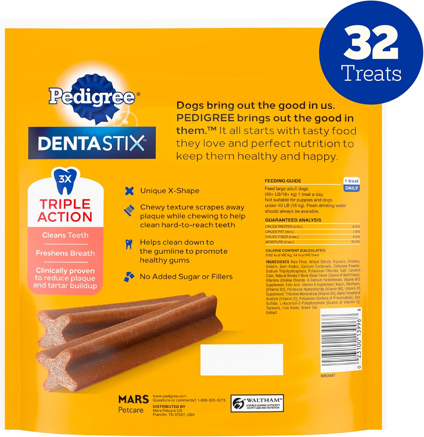 - Triple Action: Pedigree Dentastix Large Breed Dental Care Treats come with triple action which reduces tartar buildup, cleans teeth, and freshens breath