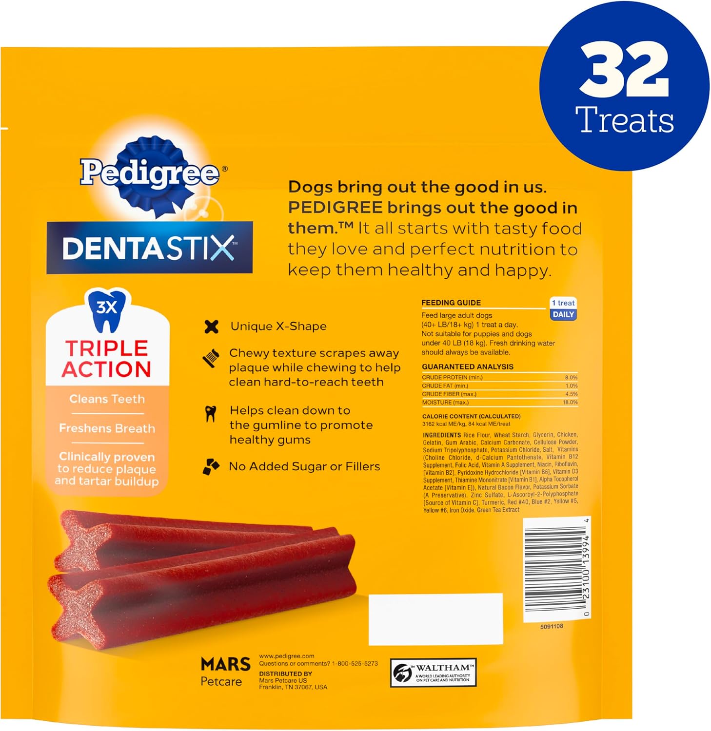 - Triple Action: Pedigree Dentastix Large Breed Dental Care Treats come with triple action which reduces tartar buildup, cleans teeth, and freshens breath