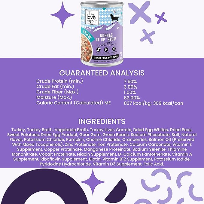 I AND LOVE AND YOU Wet Dog Food - Gobble It Up Stew - Turkey Recipe, Grain Free, Filler Free 13oz can, 12pk