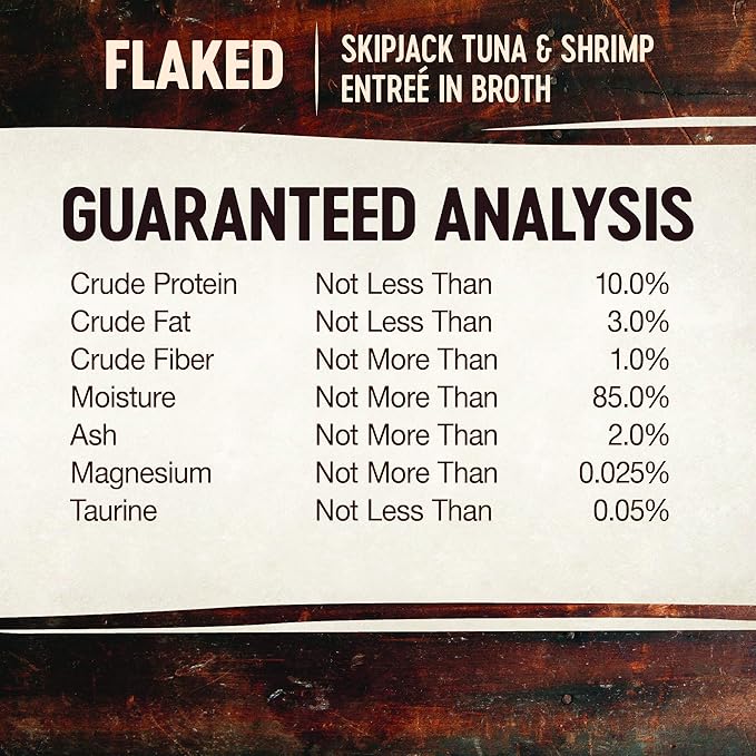 - FLAKED TUNA AND SHRIMP: All-natural wet food delivers what your cat craves. Protein-rich recipe features delicate flakes of tuna and shrimp in a delicious broth that supports daily hydration. We recommend serving at room temperature for maximum palatability.