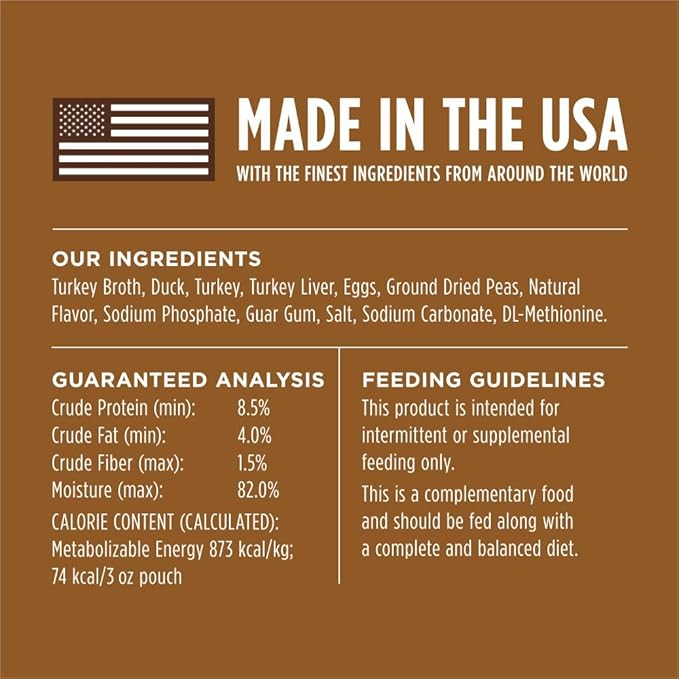 - NATURAL WET CAT FOOD TOPPER WITH SAVORY GRAVY: Grain free cuts of cage free duck in a savory gravy. Made without grain, potato, corn, wheat, soy, carrageenan, artificial colors or preservatives - ingredients known to trigger food sensitivities.