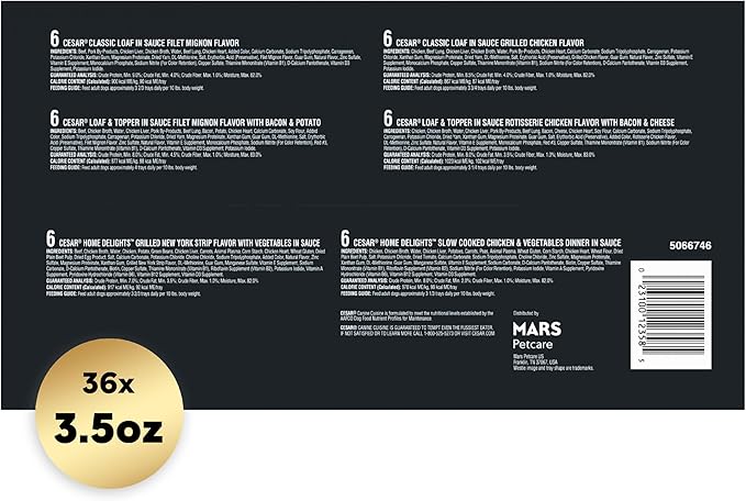 Cesar Wet Dog Food Classic Loaf in Sauce, Steak and Chicken Lovers Variety Pack with Real Meat or Real Chicken, 3.5 oz. Easy Peel Trays (36 Count, Pack of 1)