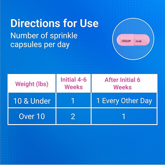 - Easy-to-Administer - Incorporating Cosequin into your cat’s daily routine is simple - just open the capsule and sprinkle the powder on their food at mealtime.