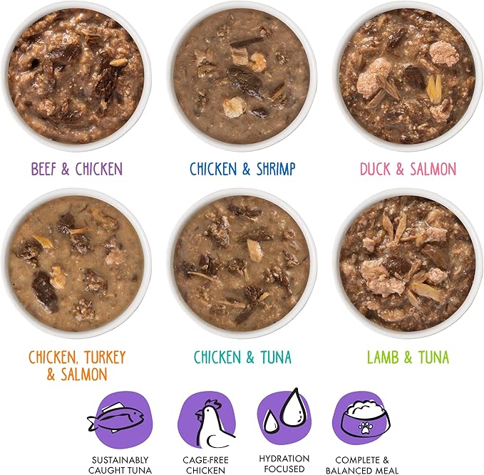 - Potluck O' Pouches Variety Pack (2.8oz Pouches, Pack of 12) OMG, Six different flavors in one variety pack! Featuring premium proteins like tuna, chicken, salmon, beef, lamb and duck in a tasty gravy.