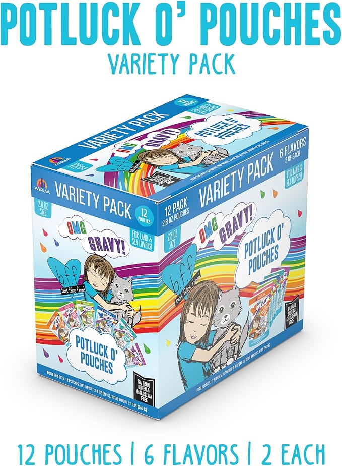Weruva B.F.F. OMG - Best Feline Friend Oh My Gravy!, Variety Pack, Potluck O' Pouches, Wet Cat Food, 2.8Oz Pouches (Pack of 12)