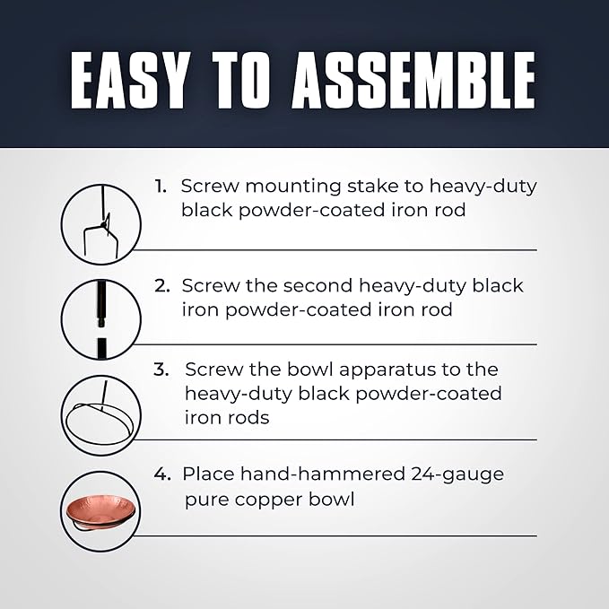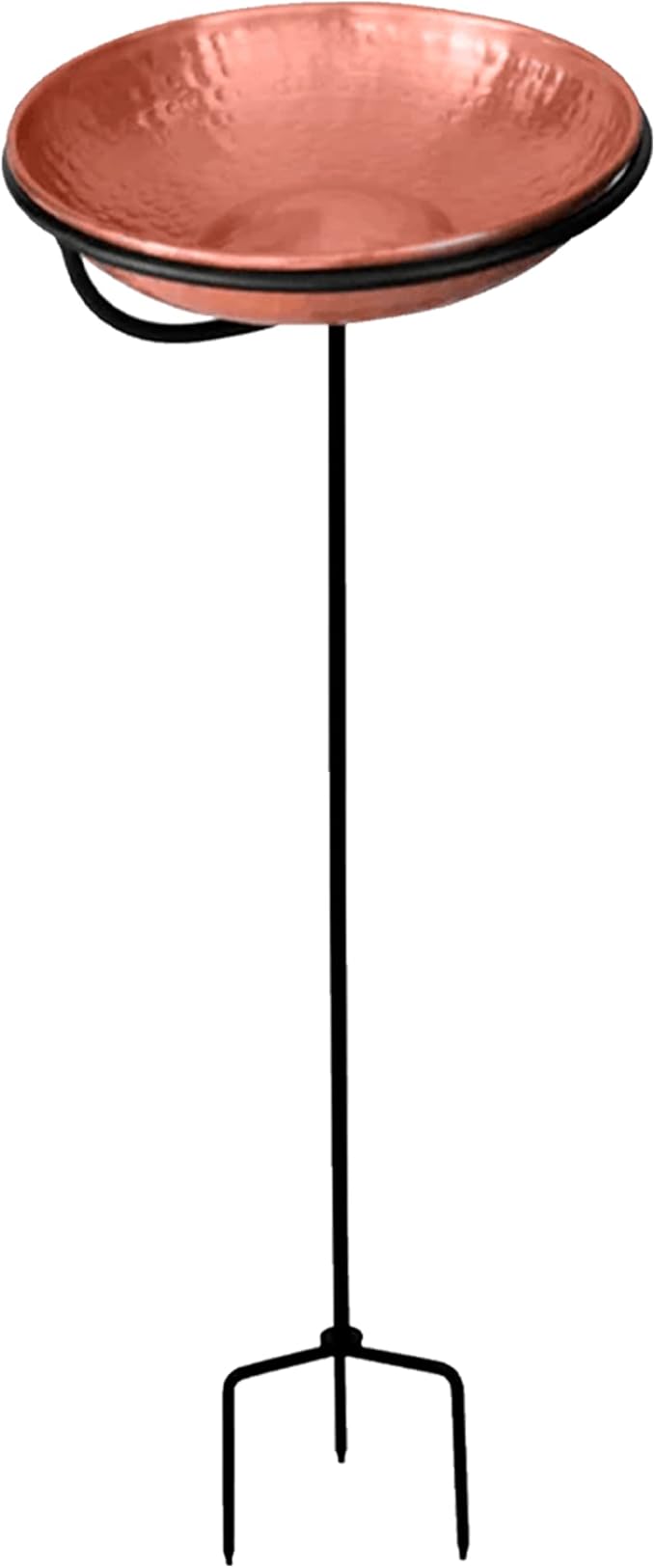 - EASY TO ASSEMBLE: No tools are needed for this standing bird bath and bird feeder. Simply screw together the three parts of the iron stand, stake it into the ground at your desired location, place the pure copper bowl on the round apparatus, and fill it with either water or bird feed. The pure copper bowl is resistant to rust and will develop a beautiful copper patina over time, making it an elegant and functional bird water bowl for years to come.