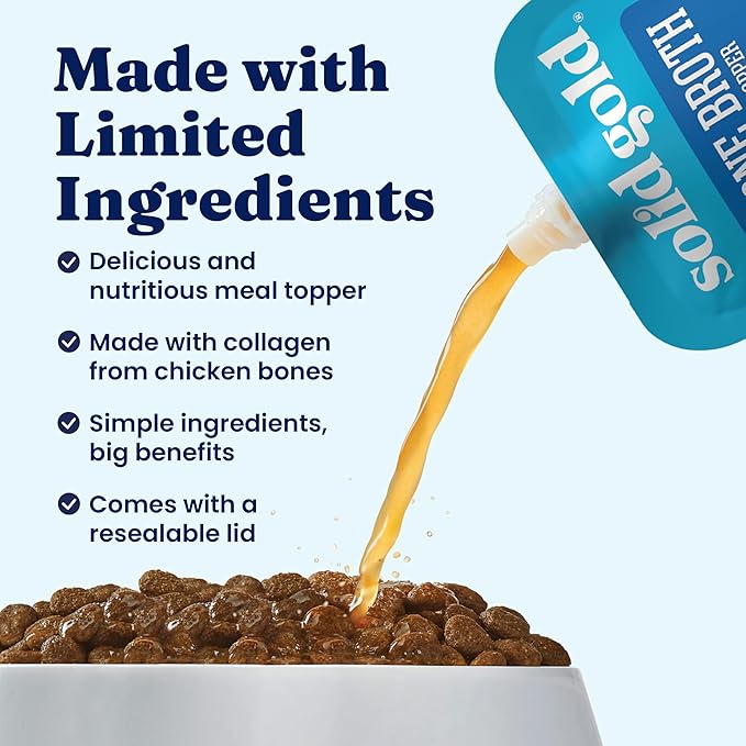 - Nutrient-Rich Bone Broth for Dogs – Solid Gold Chicken Bone Broth is a slow-simmered topper made for hydration support & enhanced flavor. Use this healthy dog bone broth as pour-over dog food toppers for dry food or freeze for bone broth dog treats