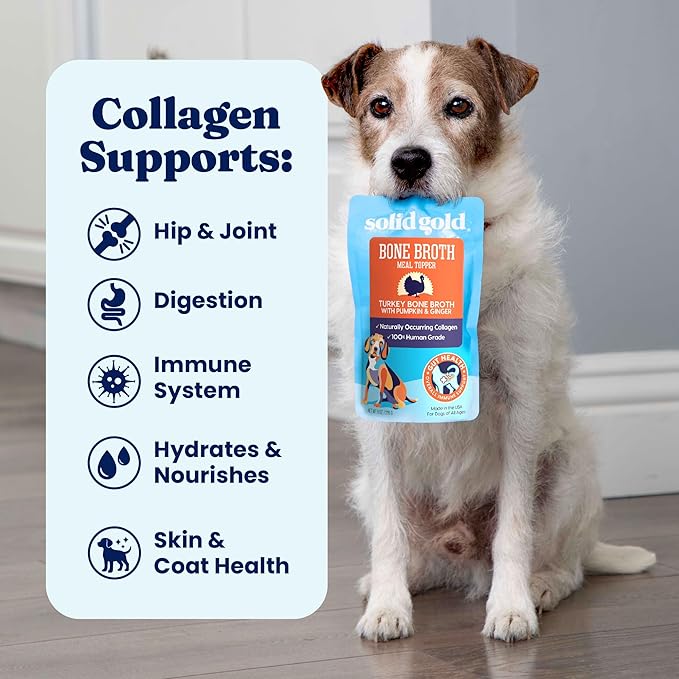 - Nutrient-Rich Bone Broth for Dogs – Solid Gold Turkey Bone Broth is a slow-simmered topper made for hydration support & enhanced flavor. Use this healthy dog bone broth as pour-over dog food toppers for dry food or freeze for bone broth dog treats