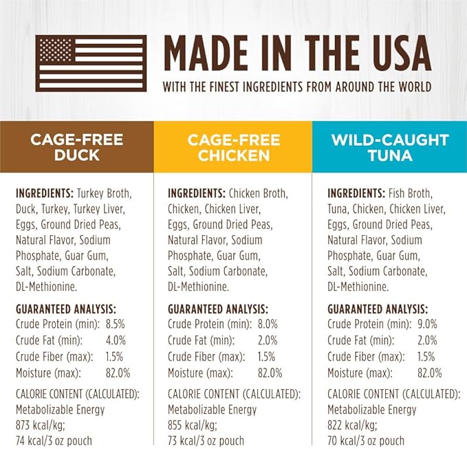 - NATURAL WET CAT FOOD TOPPER WITH SAVORY GRAVY: Made with cuts of cage free duck, cage free chicken or wild caught tuna in a savory gravy. Made without grain, potato, corn, wheat, soy, carrageenan, artificial colors or preservatives.