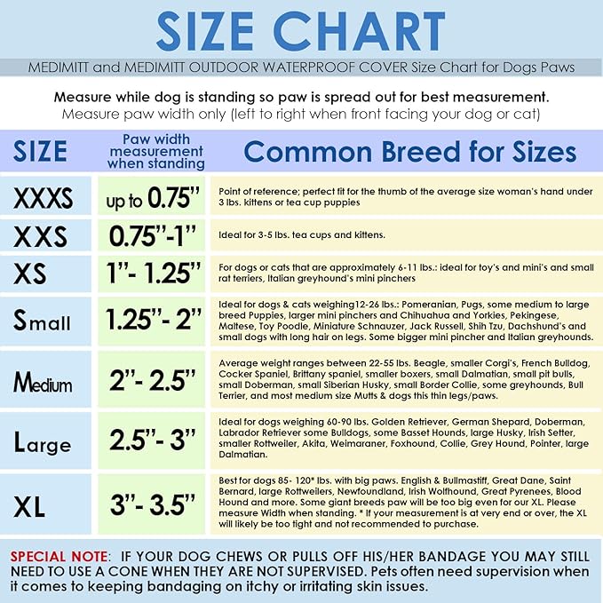 - Size XL- Paw width measurement when standing: between 3” -3.5” best for dogs 85- 120 lbs. with big paws. English & Bullmastiff, Great Dane, Saint Bernard, large Rottweilers, Newfoundland, Irish Wolfhound, Great Pyrenees, Blood Hound & more. Some giant breeds paw will be too big even for our XL. Please measure Width when standing If measurement is at very end or over, the XL will likely be too tight and not recommended to purchase. IF YOUR DOG CHEWS/PULLS OFF THEIR BANDAGE YOU MAY STILL NEED CONE