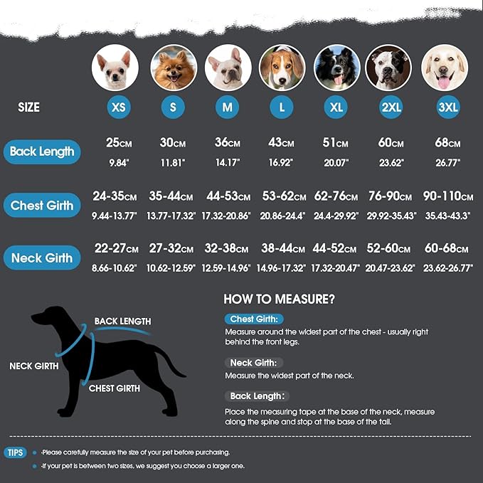 - SIZE INQUIRY: If you don't make sure which size to choose, you can measure your dog firstly then contact us for a recommended size. We are pleased to help you to choose a suitable dog coat for your furry friend.