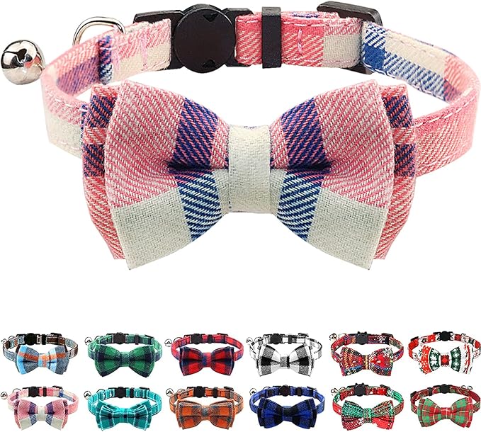 Joytale Upgraded Cat Collar with Bells, Breakaway Cat Collars with Bow Tie, 1 Pack Girl Boy Safety Plaid Kitten Collars, Pink