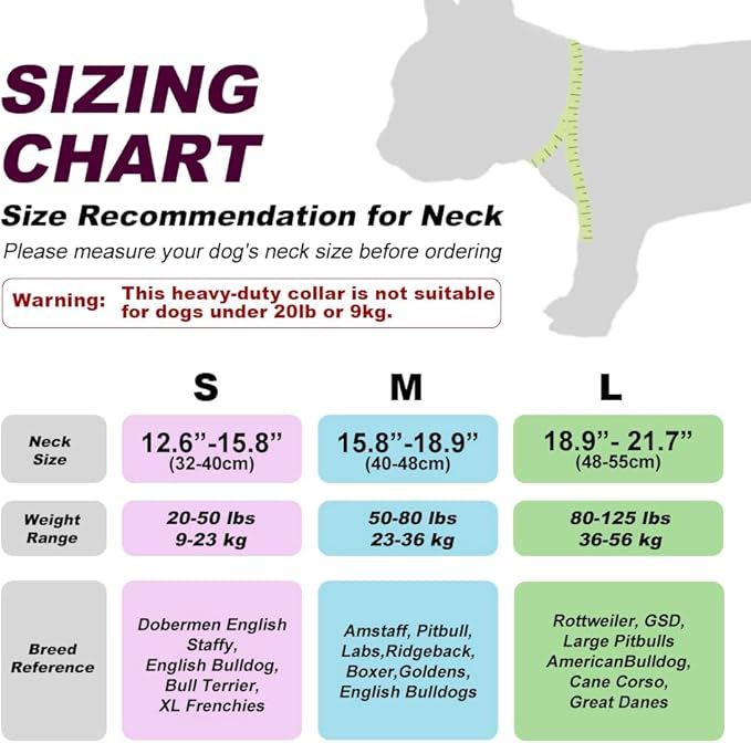 - Metal Collar for Dogs. This wide dog collar features 4 adjustable points, making it easy to adjust for a comfortable fit and attach to a dog leash or other dog accessories. Please refer to the size chart and carefully measure your dogโs neck before purchasing to ensure the dog collar fits well. Neck size range (S: 12.6โ-15.8โ, M: 15.8โ-18.9โ, L: 18.9โ-21.7โ)