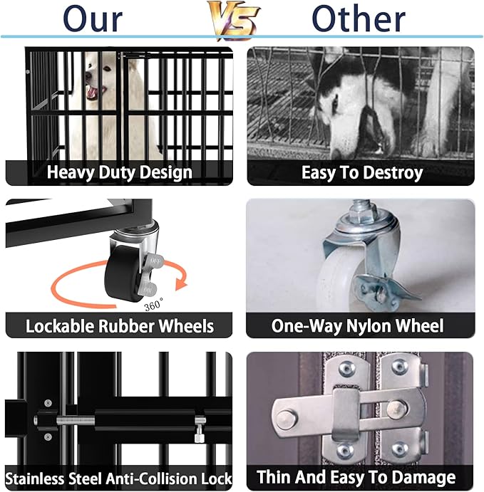 - Easy To Assemble & Move: The four caster wheels on the bottom are lockable, and we like that the design makes it difficult for high anxiety dogs to escape or cause harm to themselves or damage the cage.Most of the parts were pre-assembled, fit it with four wheels and ten screw bolts, only takes within 10 minutes to complete.