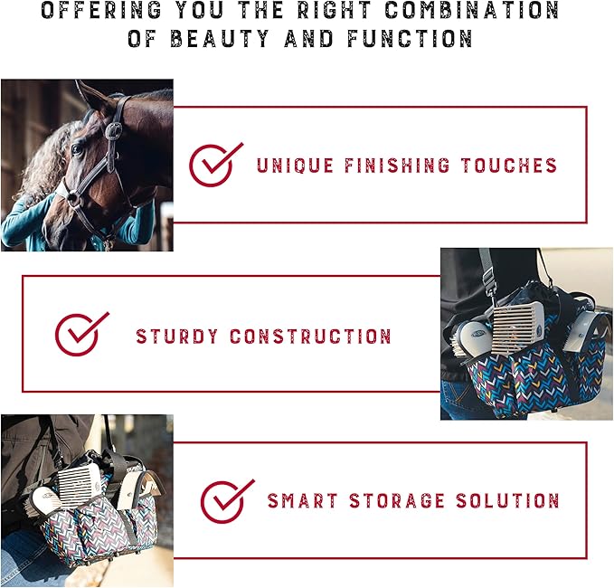 - Comfortable and Portable: Designed for easy use, the adjustable grooming bag for horses includes comfortable webbing handles and soft padded shoulder strap with on and off snap; effortlessly carry this lightweight equine grooming kit wherever you go