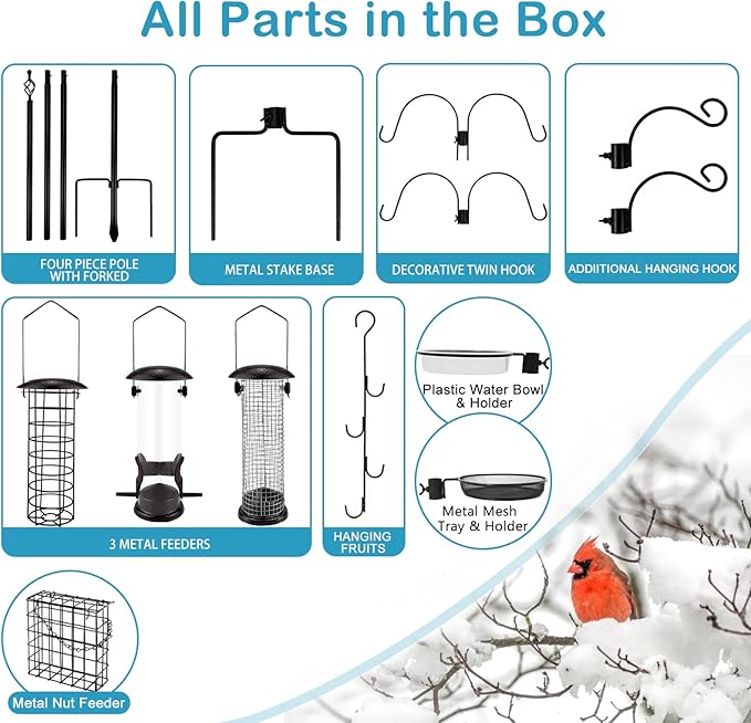 - Stable: The base of outdoor bird feeding stand pole has five prongs. When inserted into the ground, five prongs hold the ground firmly, and all the hooks have a deep curvature Therefore, the bird feeder kit is not easily blown over by the wind