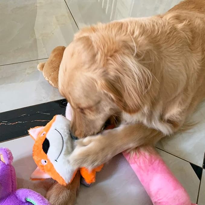 - Soft Plush Creates Chewing Satisfactions For Their Natural Instinct. Multiple Squeakers and Vibrant Colors Attracts Dogs' Attention.