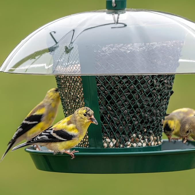 - WEATHERPROOF DESIGN: Built to withstand outdoor elements, the clear top cover helps keep seeds dry in any climate and protect birds from rain and snow. Bottom seed tray features drainage holes to support longer-lasting food. Dome measures 12 inches