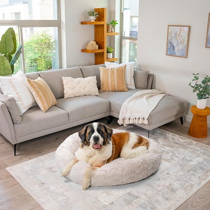- Calming Dog Bed: 45-inch donut cuddler provides a cozy haven to help soothe anxiety and stress in extra large dogs up to 150 lbs; ideal for breeds such as Bernese Mountain Dog, Saint Bernard, Newfoundland, Bullmastiff, etc