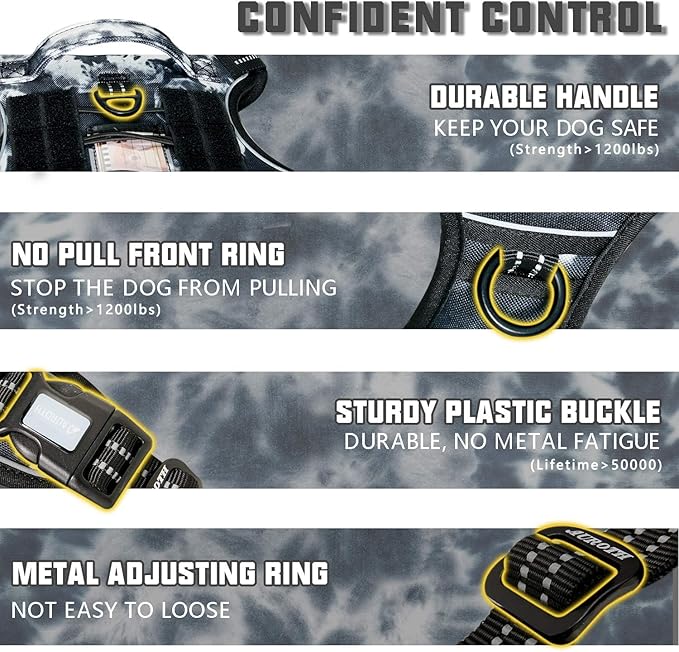 - 【Ultimate Control & SECURITY - Unleash the Power.】 Our no pull dog harness ensures maximum control for your dog with two metal leash attachment points. The front clip provides no-pull control and is great for training, while the back clip is perfect for casual walks or jogging. Walk your dog with confidence and security.