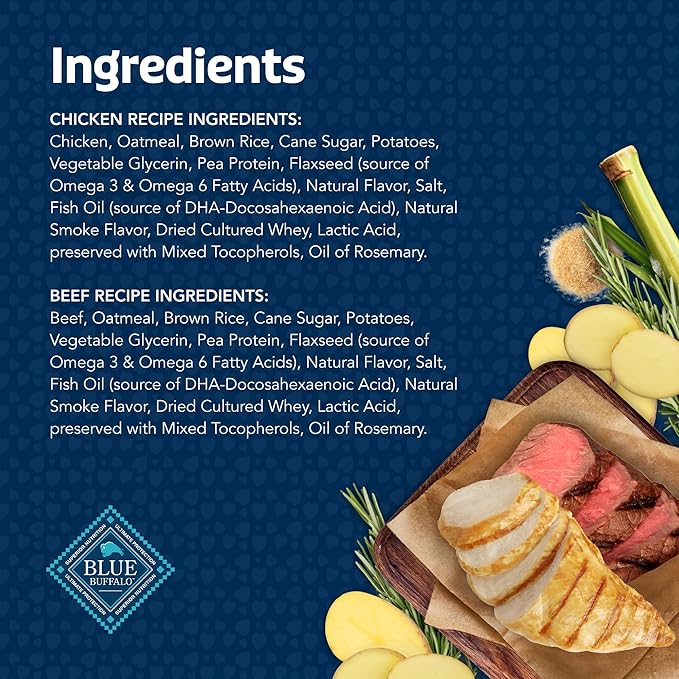 - Contains two 19-oz bags of BLUE Bits Natural Soft-Moist Training Dog Treats, Chicken Recipe and Beef Recipe