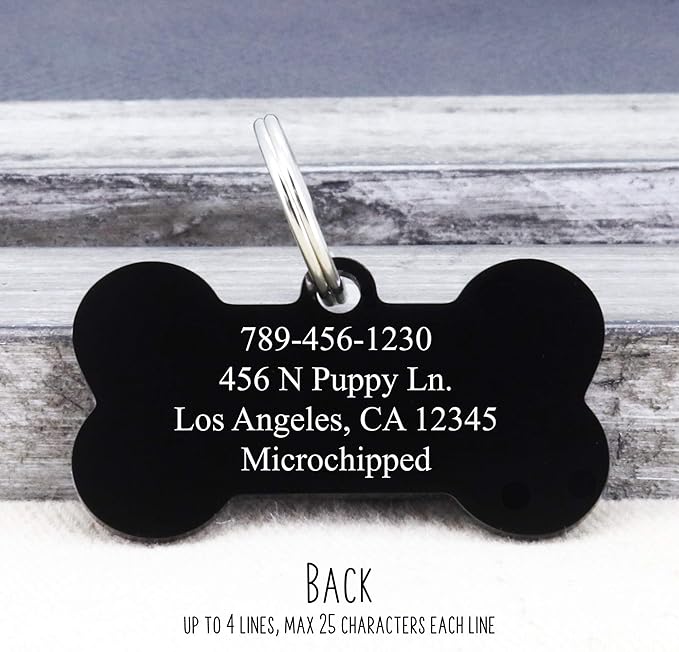 - These pet tags can be engraved both side with back engraving options, the front will be your pet name and the back engraving could be phone number, address, 'microchipped' etc.