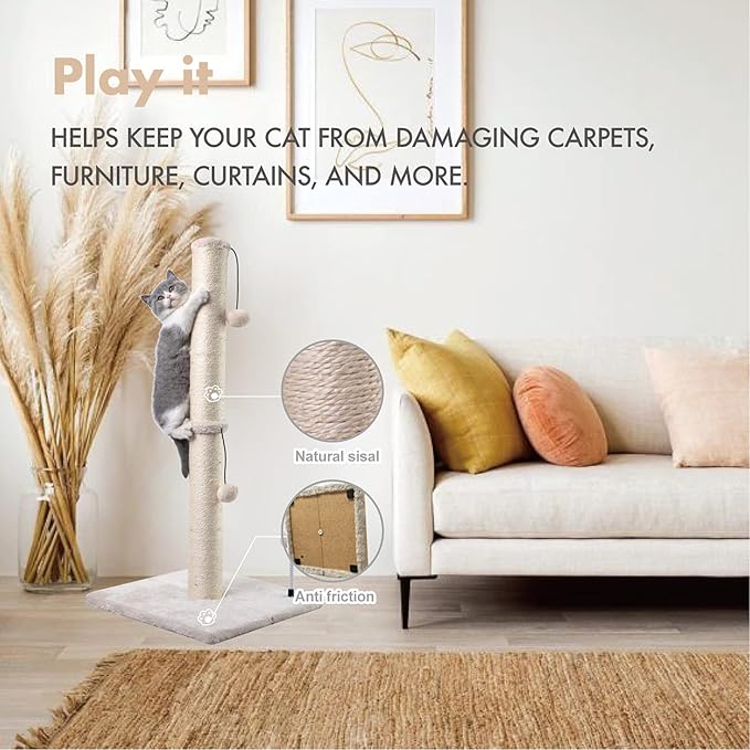 MECOOL 34” Tall Cat Scratching Post Premium Basics Kitten Scratcher Sisal Scratch Posts Trees with Hanging Ball for Indoor Cats, Beige