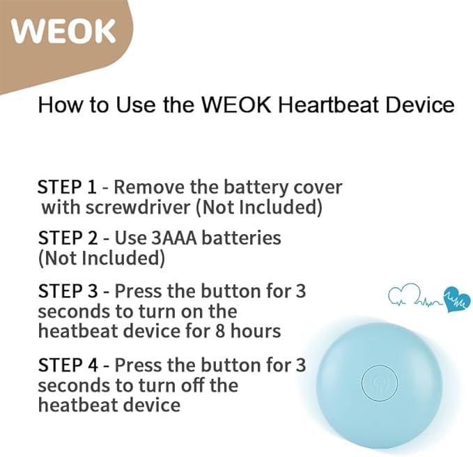 - Our Service: we hope to provides the best company and comfort to puppies, cats. If you have any question, please do not hesitate to contact us. We will feedback to you ASAP.Important tips for heartbeat device : Press and hold the switch long enough,it works; Press and hold the switch long enough,it stops.