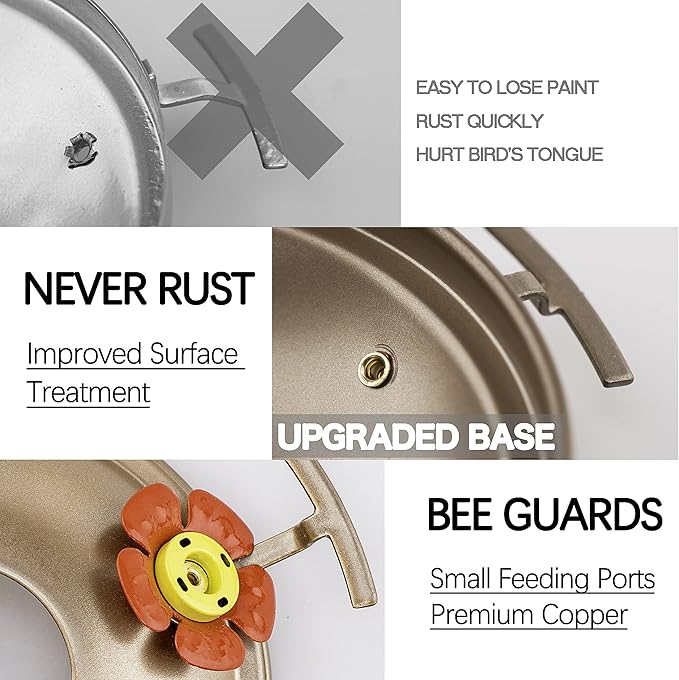 - 【Leakproof and SAFER Feeder Ports】The metal base is equipped with sealing ring and plastic basin for leakproof. UPGRADED feeder ports are made with premium copper materials, no sharp edges will cut or catch the hummingbirds' tongue. Make sure the gasket is securely attached before you hanging the hummingbird feeders outside.