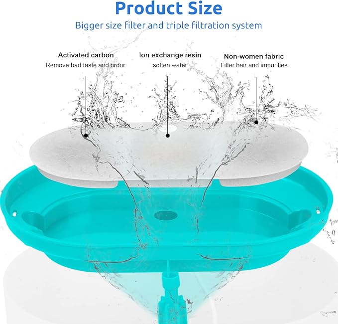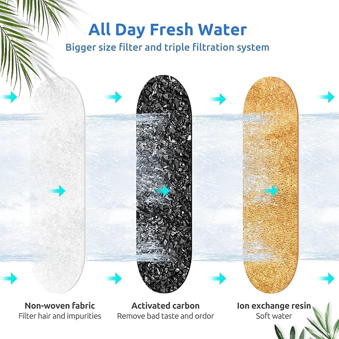 - 【Healthy Filter Material】: The pet fountain filters is composed of high-quality activated carbon and ion exchange resin to form a three-layer filtration system, they can filter hair and residue, absorb odors, soften water and achieve good purification performance.