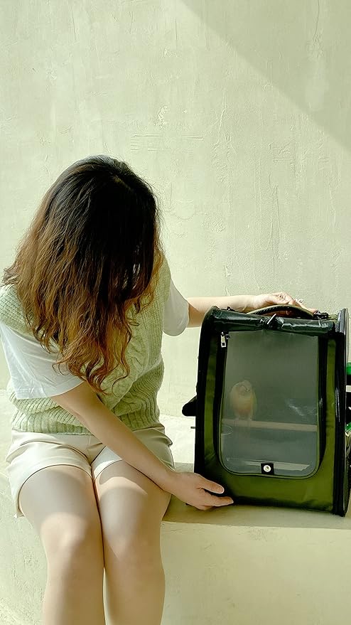 - đăCalming Environmentă New environments can be stressful for birds. The front and side mesh can be covered with flaps to create a calming, enclosed space that helps your bird relax during travel.