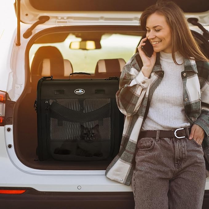- ð¶ãVENTILATED & WASHABLEã: â Large Dog Travel Carrier has 4 sides breathable & anti-scratch mesh window; â¡ Washable Mat with a hard panel to stand lying inside;⢠More stable Dog Crates add reinforced plastic sheet on the top and use stronger steel material on the frame, which can keep the shape from collapsing; ⣠2 pcs of the adjustable hammock for cats.