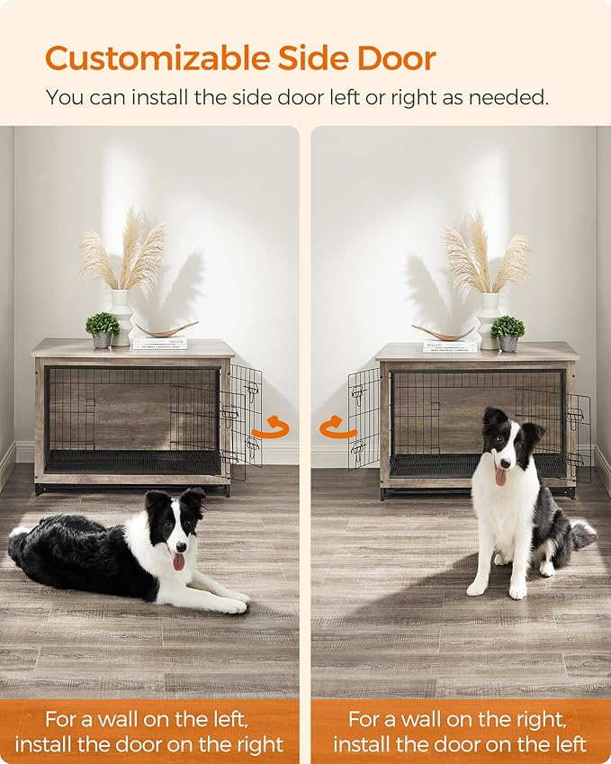 - [Door Left, or Door Right] You decide. This dog kennel comes with 2 doors (1 front door and 1 side door) for your dog to go in and out easily; the side door can be either installed to the left or right to fit various spaces