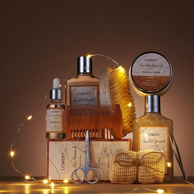 Birthday Gifts for Men, Spa Gift for Him, Dad, Mens, Husband - 11pc Vanilla Almond Unique Grooming Self Care Baskets, Personal Beard Care Gifts for Men Who Have Everything