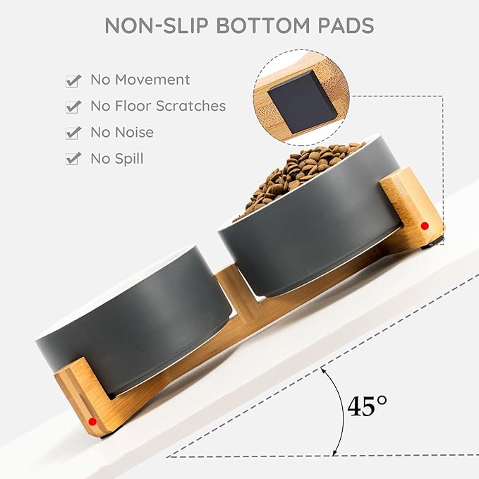 - [Double Bowl Design]:One dog bowl for food and one for water, Each ceramic cat bowl has a Unique wooden stand, raising the dishes closer to your pet for more comfortable eating