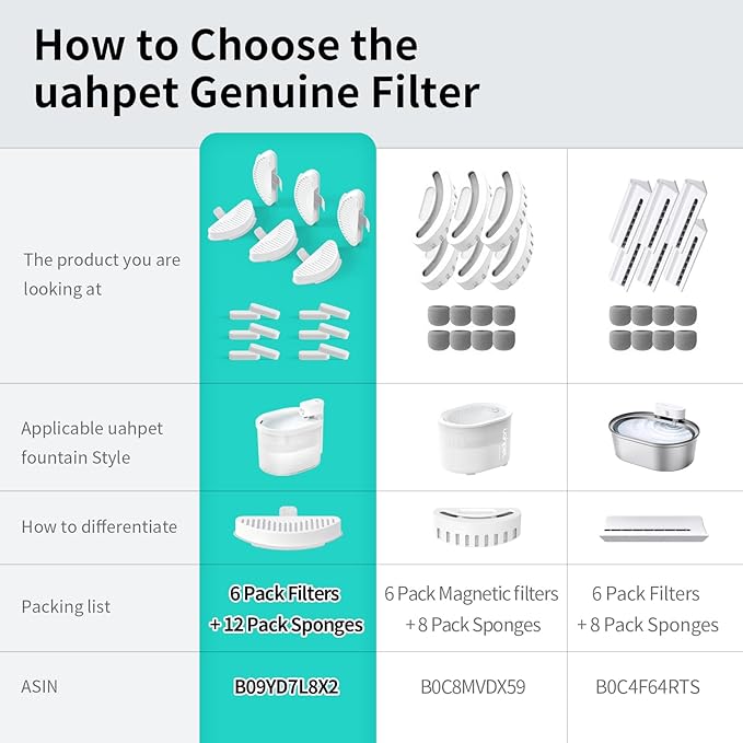 - uahpet Official 6 PACK: Package includes 6-pack of pet fountain replacement filters and a 12-pack replacement filter Sponges. They are individually packaged and sealed to maintain