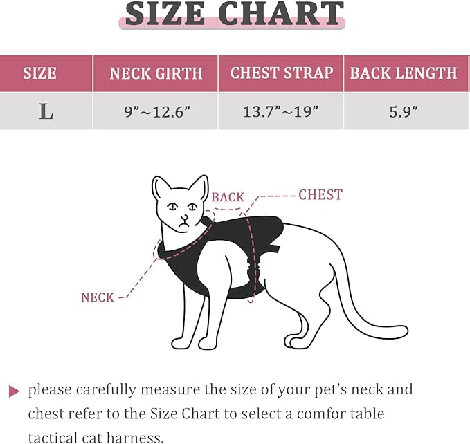 - Cat Harness Leash Set:Size measuring [NECK GIRTH: 9”-12.6”, CHEST GIRTH 13.7-19”].ATTENTION: Please carefully size chart before order.Designed for large,adult,fat cats.This harness is not meant for newborn babies or small kittens. Package includes: tactical cat harness, 2 embroidered patches.