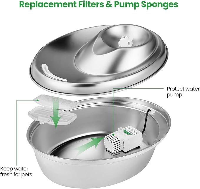 - Compatibility: 12Pack replacement filters & 6 pump sponges set ONLY compatible with D30 67oz/2L stainless steel pet water fountain
