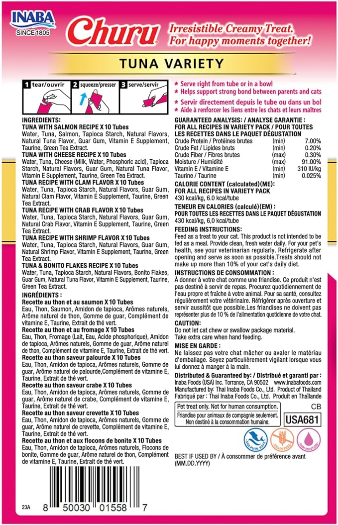INABA Churu Cat Treats, Grain-Free, Lickable, Squeezable Creamy Purée Cat Treat/Topper, 60 Servings, Tuna Variety Box