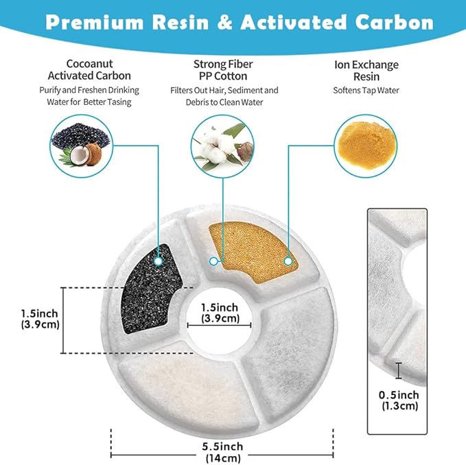 - ☘【Perfect Match】-- Our cat Fountain Filters are made of organic materials like double-layer cotton, Size: 5.5'' in diameter,compatible with 84oz/2.5L cat Fountain catit.and fit for other same size of pet fountains as well, please double check the size before purchasing.