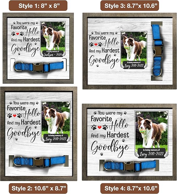 - ITEM DIMENSIONS: Our customized pet loss sign comes in two sizes, 8x8" and 8.7x10.6," and serves a variety of purposes. Additionally, you may use a personalized pet memorial frame as a table decoration or as a part of your home decor by placing it on a shelf, mantle, table, or wall. It will be a lovely pet memorial piece.