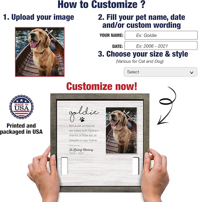 - ITEM DIMENSIONS: Our customized pet loss sign comes in two sizes, 8x8" and 8.7x10.6," and serves a variety of purposes. Additionally, you may use a personalized pet memorial frame as a table decoration or as a part of your home decor by placing it on a shelf, mantle, table, or wall. It will be a lovely pet memorial piece.