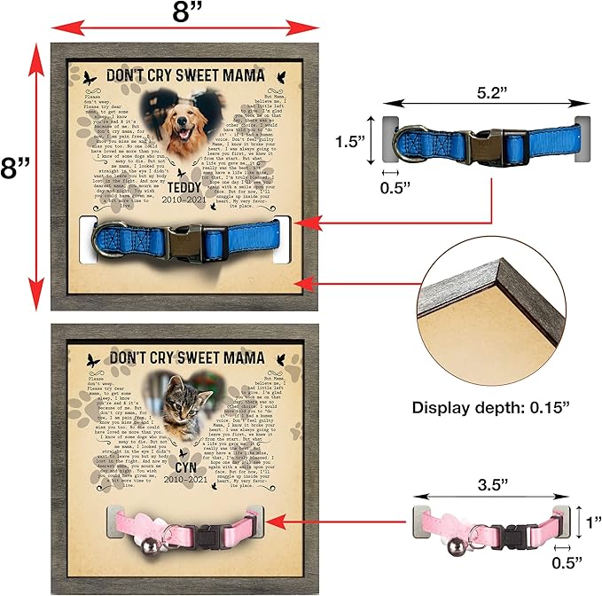 - HIGH-QUALITY MATERIAL: The cat collar picture frame for dog lovers is made of sturdy Plywood. Furthermore, we have two frame colors to choose from: grey and walnut. Having a beautiful keepsake to look at every day can help to alleviate some of the pain. Please keep in mind that the pet collar is NOT included.