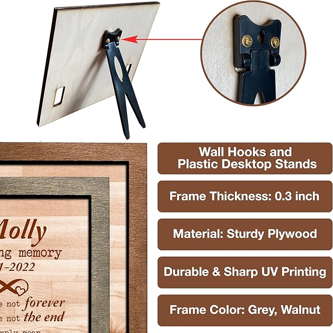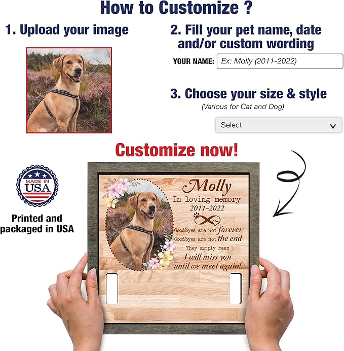 - ITEM DIMENSIONS: Our customized pet loss sign comes in two sizes, 8x8" and 8.7x10.6," and serves a variety of purposes. Additionally, you may use a personalized pet memorial frame as a table decoration or as a part of your home decor by placing it on a shelf, mantle, table, or wall. It will be a lovely pet memorial piece.